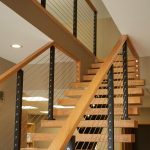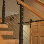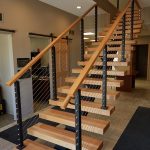 Red oak treads, handrail, and black aluminum posts blend cohesively with the sliding barn doors and iron fixtures. The graspable red oak handrail blends so seamlessly with the rest of the design that you almost miss it. Tried-and-true cable railing effortlessly ties the whole project together. The result is an elegant, unique floating staircase that perfectly matches this rustic-modern interior. Who says safety can’t be chic?