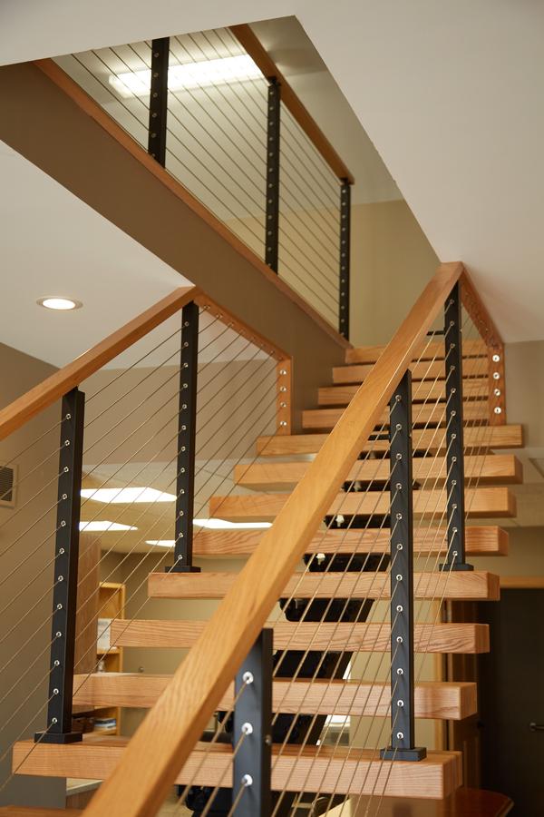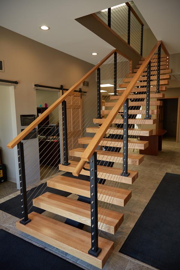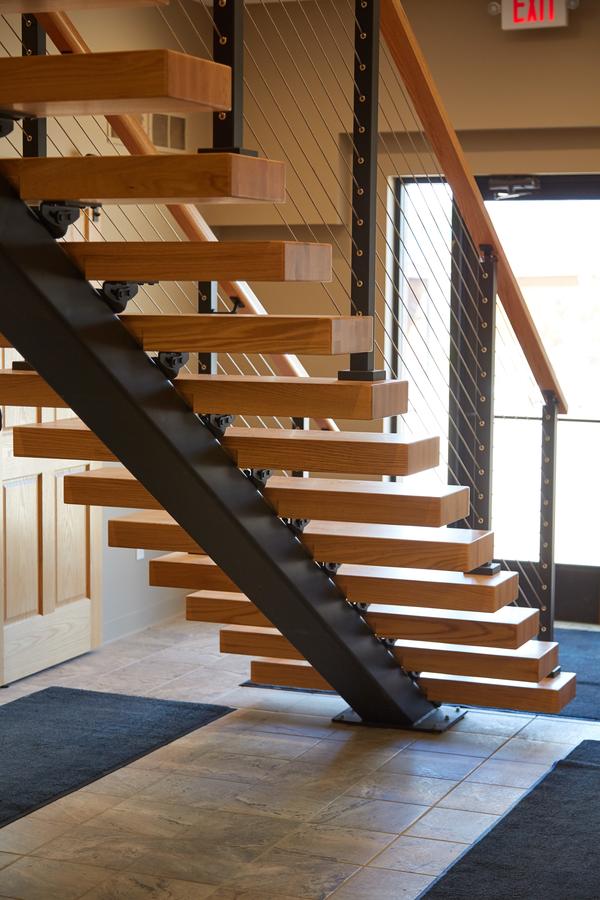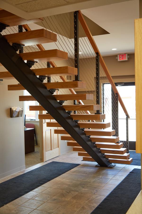 This office in Petoskey, Michigan needed a staircase that could fit into a small space without sacrificing safety or style. However, traditional staircases often make small spaces feel crowded and boxy. Our FLIGHT floating staircase was the perfect solution, creating an area that is open, airy, and beautiful.