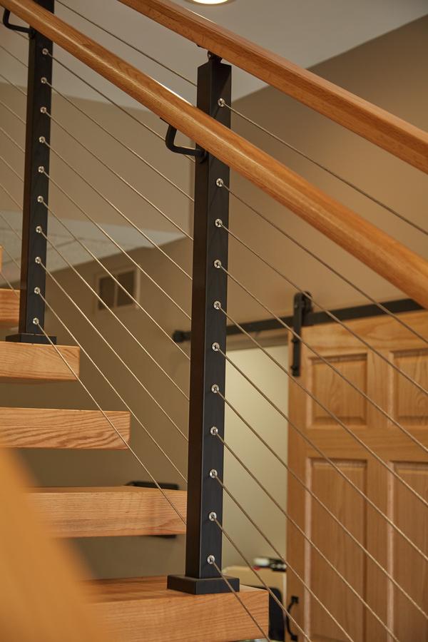 Red oak treads, handrail, and black aluminum posts blend cohesively with the sliding barn doors and iron fixtures. The graspable red oak handrail blends so seamlessly with the rest of the design that you almost miss it. Tried-and-true cable railing effortlessly ties the whole project together. The result is an elegant, unique floating staircase that perfectly matches this rustic-modern interior. Who says safety can’t be chic?