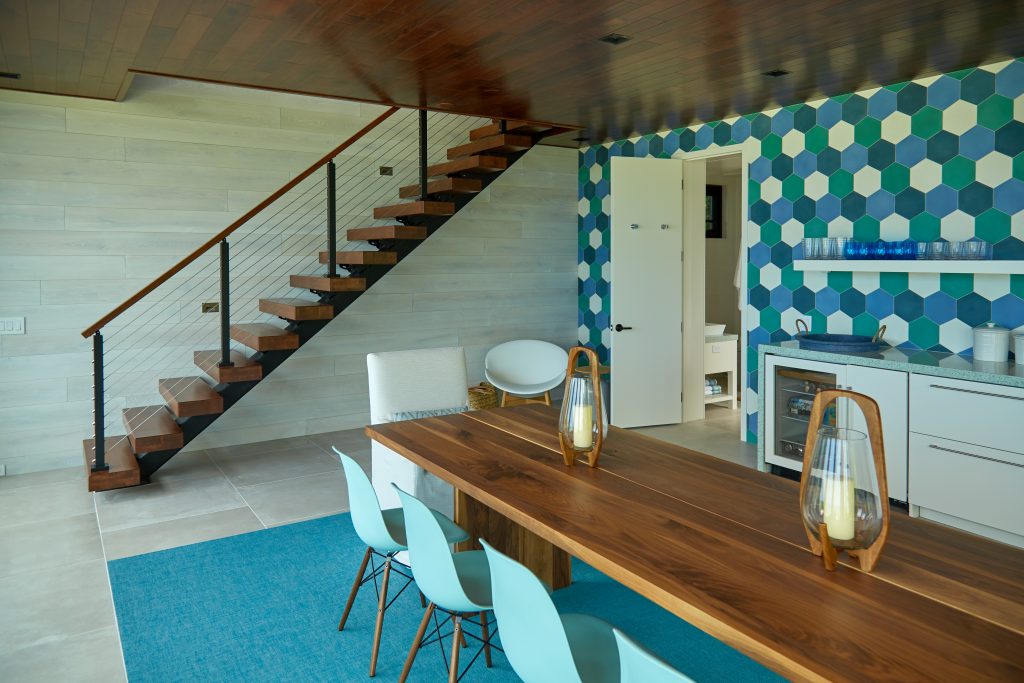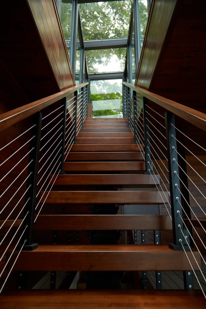 Finally, the inside of this condo is no less stylish and spacious than the outside. Thick wood treads on the beautiful floating staircase match perfectly with the wood table. Sleek cable railing lines run the height of each story, tying together each level with a simple, modern touch. Together, glassfloating stairs, and cable railing are the perfect finishing touches for this prestigious home.