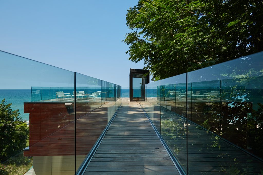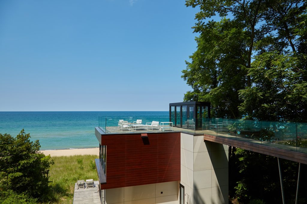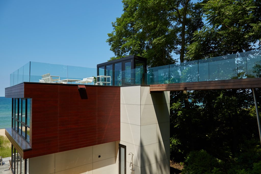 The rooftop patio offers a birds-eye view of the charming lake and beach. We knew the roof’s railing had to be able to withstand lake effect winds, provide exceptional security, and maintain excellent views all around. Glass railing checked all of these boxes. Glass railing is an excellent windbreaker, but still allows small breezes to pass through so guests can enjoy the gentle winds from Lake Michigan.