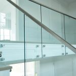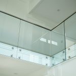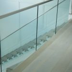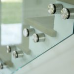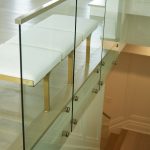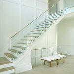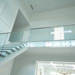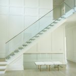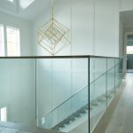 With its slim profile and clean, crisp look, glass railing will give any staircase a modern flair. This home in Southampton, NY features elegant glass railing paired with a stainless steel graspable metal cap and our innovative standoff pins. Clear glass panels provide a natural complement to this space’s already minimalist, open design. This foyer is truly a masterpiece.