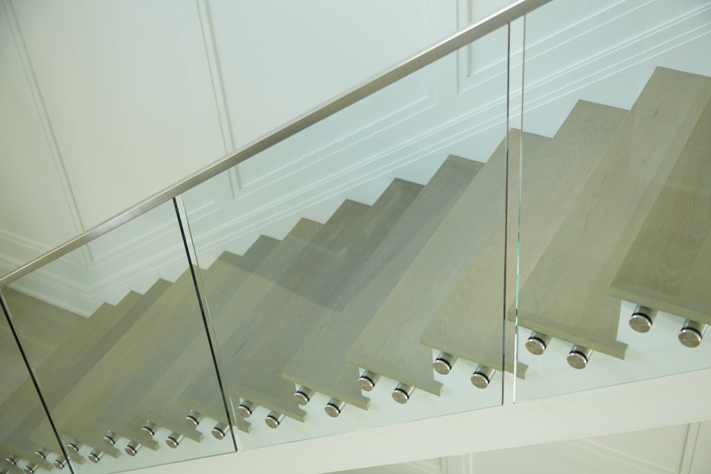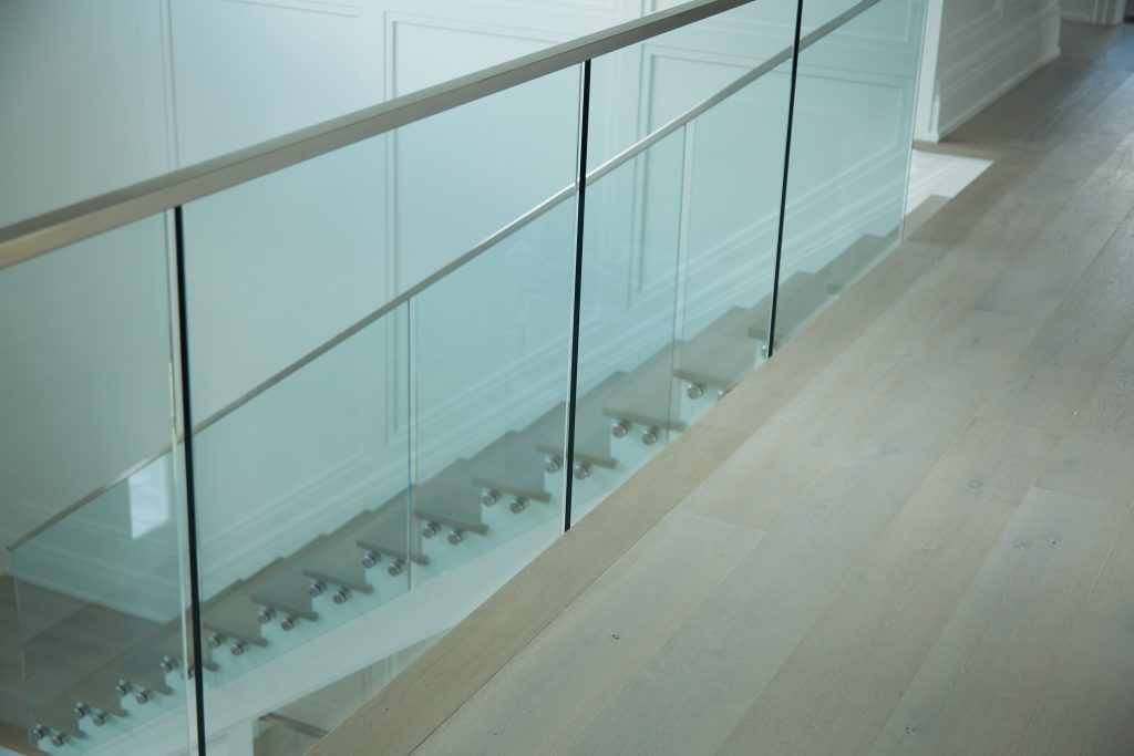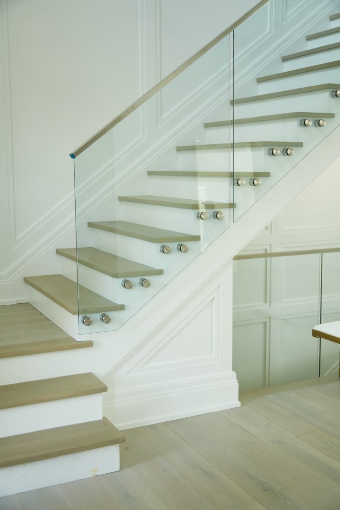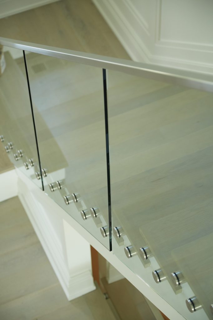 With its slim profile and clean, crisp look, glass railing will give any staircase a modern flair. This home in Southampton, NY features elegant glass railing paired with a stainless steel graspable metal cap and our innovative standoff pins. Clear glass panels provide a natural complement to this space’s already minimalist, open design. This foyer is truly a masterpiece.
