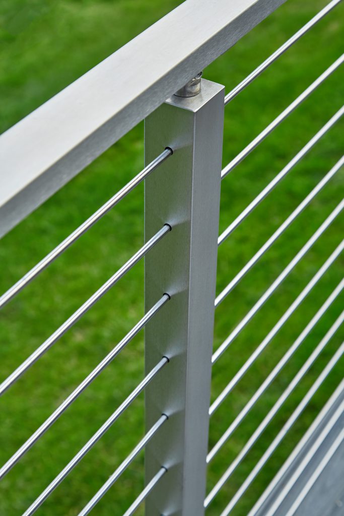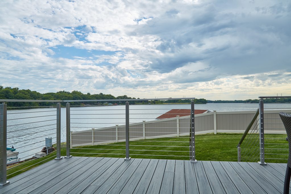 This gorgeous system was installed at a yacht club in Bellevue, Michigan, and shows off everything we love about rod railing. Its fluid, parallel lines blend with the view of the lake in the background while also complementing the gray tones of the deck. A sleek stainless steel handrail tops off the system — practically shining against the backdrop of lake and sky. This stainless steel rod railing system is simple, modern, and of the highest quality.