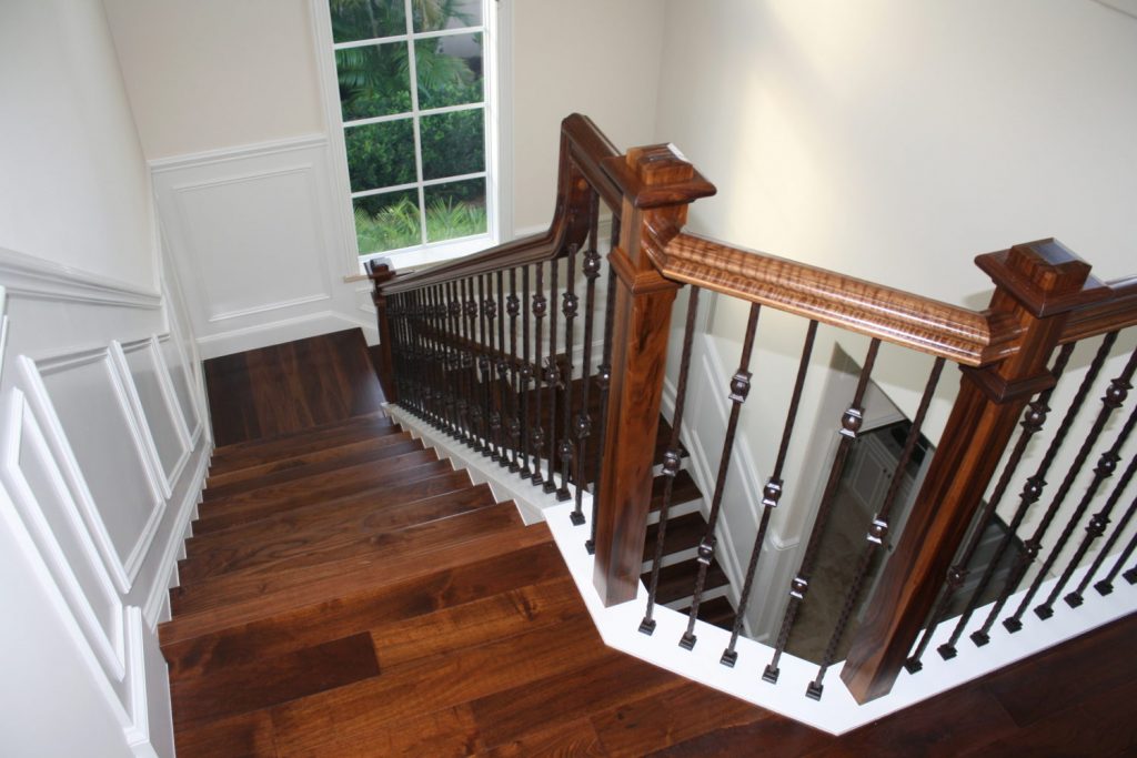 This stunning home features a large staircase with several flights of stairs. The beautifully crafted wood stair parts provide contrast against the white walls and risers. Furthermore, this railing highlights an elegant iron baluster design from our forged series. Using the single and double knuckle balusters side by side gives addition visual interest to this lovely banister. To see what wrought iron baluster design suits you, you can use our iron baluster design tool. This tool allows you to drag and drop different balusters into a virtual space, allowing you to compare and contrast baluster layouts. Furthermore, our team of sales representatives is happy to answer your baluster design help questions.