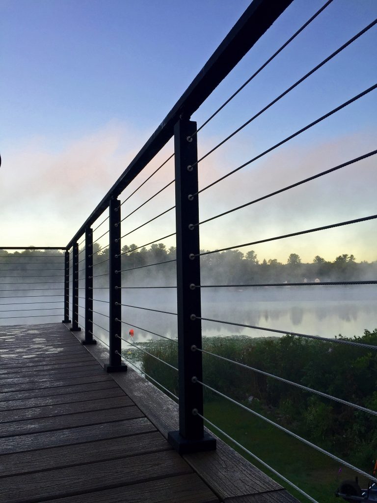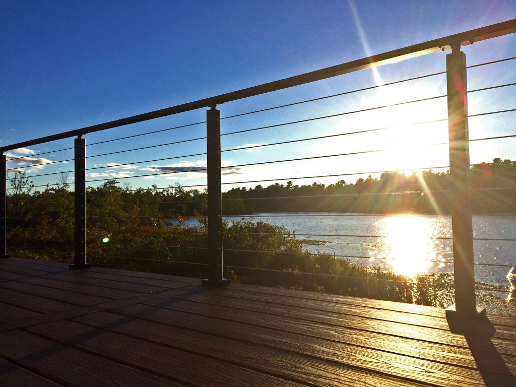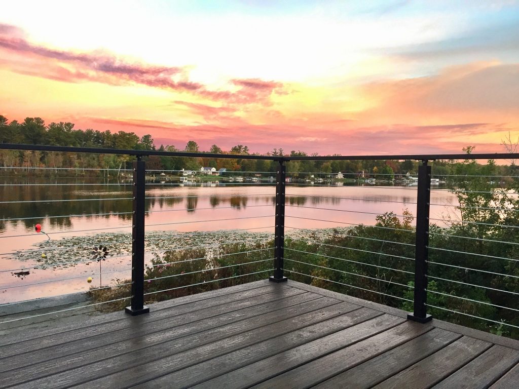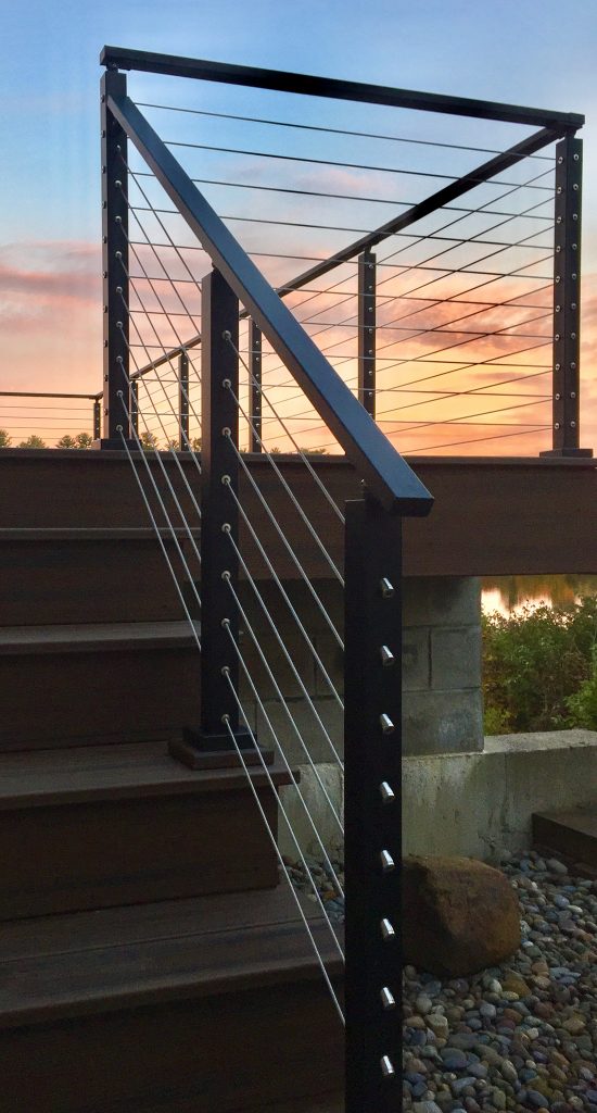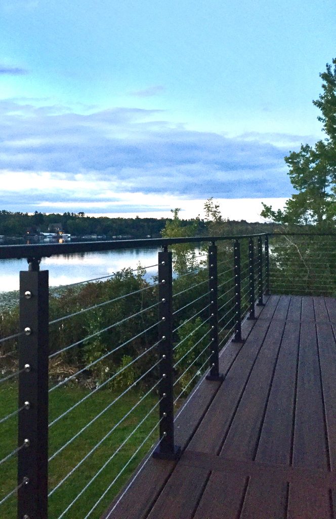 This cable railing system features aluminum posts and handrail with black powder coat. Aluminum is a great, durable material that is perfect for this lakefront application. This exterior cable railing is beautiful on its own. However, with the natural view shinning through the cable, the system becomes even more stunning. Due to the lasting strength and beauty of our cable railing, this customer has many more unobstructed sunset views to look forward to.