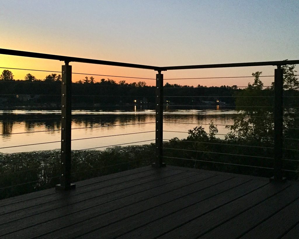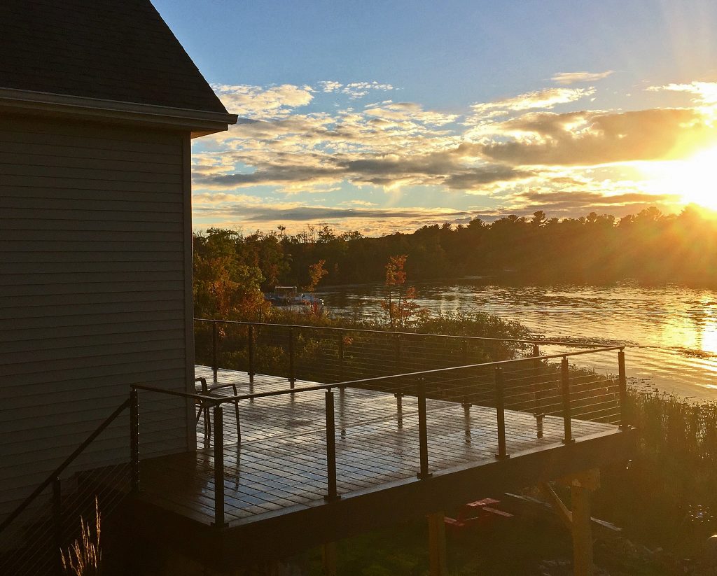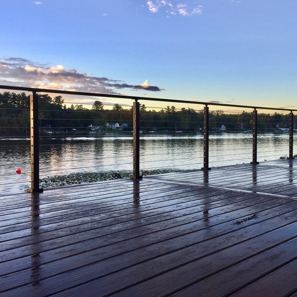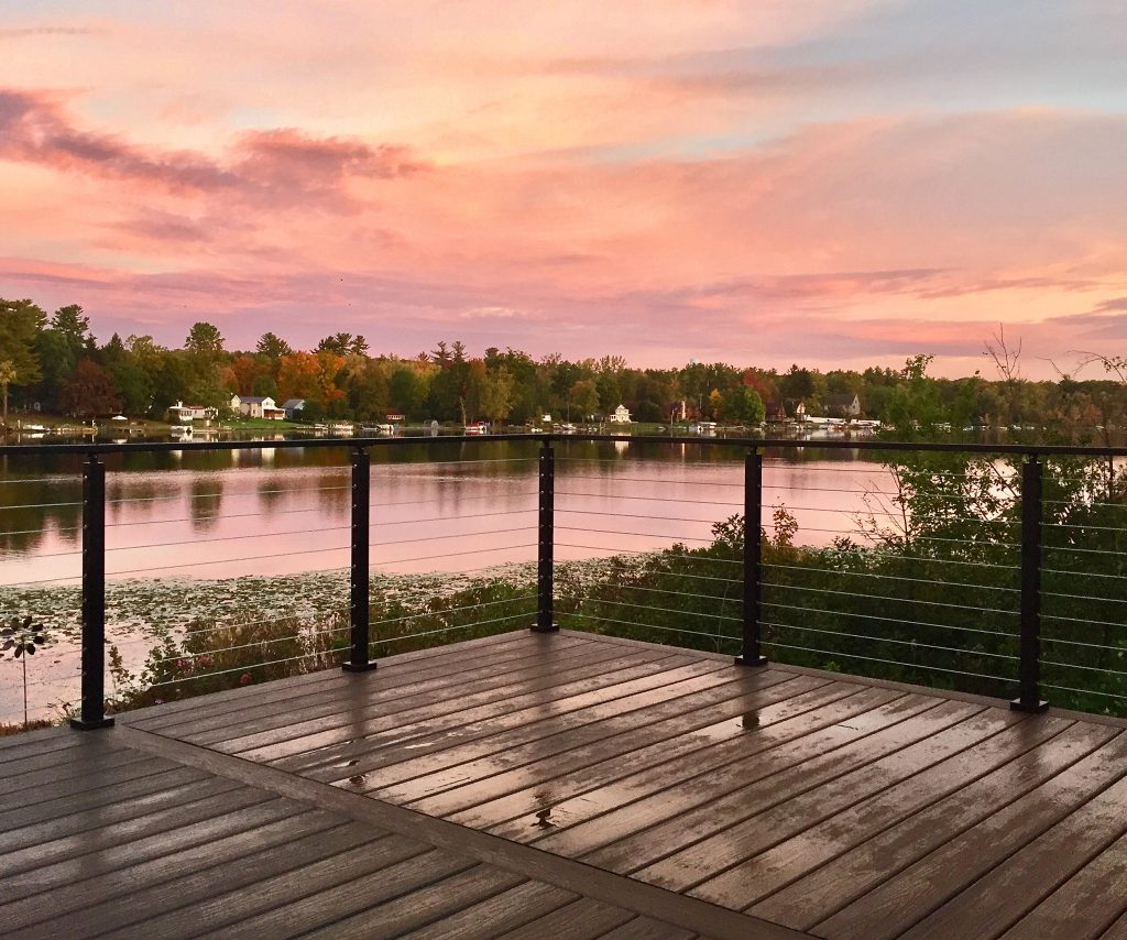 This cable railing system features aluminum posts and handrail with black powder coat. Aluminum is a great, durable material that is perfect for this lakefront application. This exterior cable railing is beautiful on its own. However, with the natural view shinning through the cable, the system becomes even more stunning. Due to the lasting strength and beauty of our cable railing, this customer has many more unobstructed sunset views to look forward to.