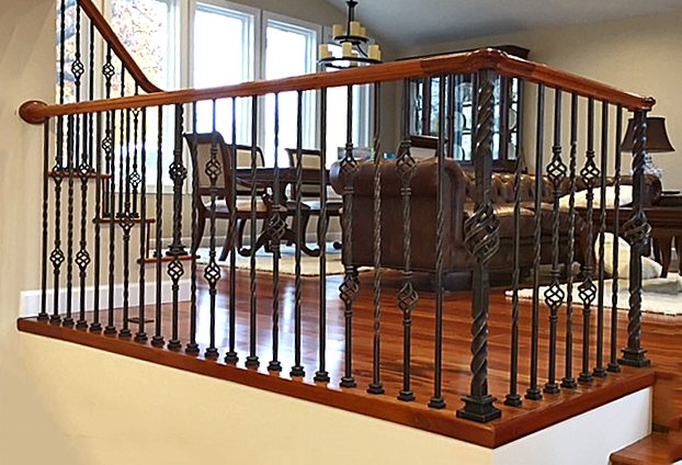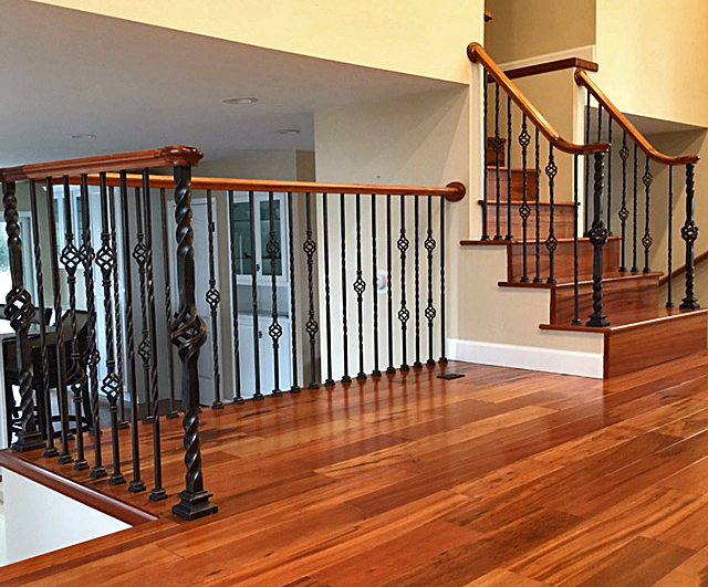 This spacious home uses the elegance of wrought iron balusters and the character of tigerwood handrails to achieve their gorgeous design. The featured balusters are from the twist series, which is the most popular of our vast selection. In addition to the balusters, these customers elected to use iron newels rather than wood ones. Here the single basket dual twist newel blends in seamlessly with the rest of the design. Though from a distance these balusters nearly appear black, they are actually brushed bronze. This allows them to fit in harmoniously with the colorful wood floor around them.
