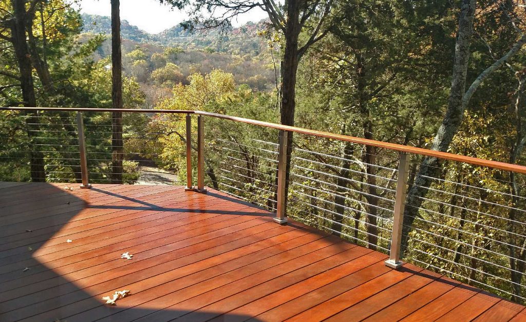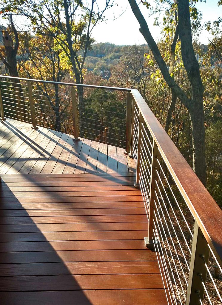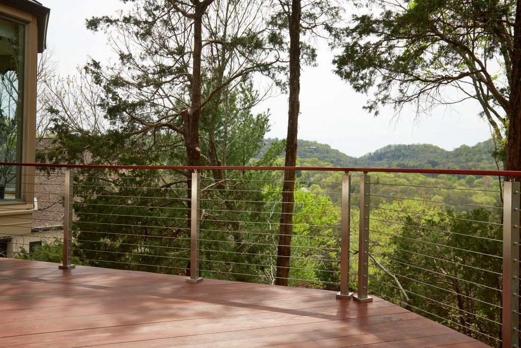 This home in the heart of Nashville boasts outstanding views of the rolling mountains. The brushed stainless steel posts catch and reflect the glistening sun. Concurrently, the wood handrail makes the system cohesive with the natural surroundings. In his design, this customer elected to double post the corners of this deck to provide extra durability and tensioning strength to the system. In this scenario, the doubled posts remain sleek and allow the full view to shine through.