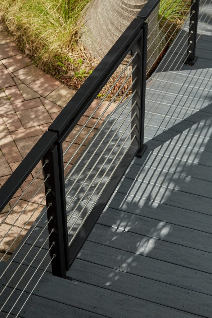 At this waterside home, a customer used black cable railing posts to accent the border of his gorgeous back deck. The powder coated posts pop alongside the lush, green palm trees and the blue Florida sky. A gate with rod railing infill provides an easy entrance and exit point to this exquisite getaway where the homeowner can sit back, relax, and enjoy his view for years to come.