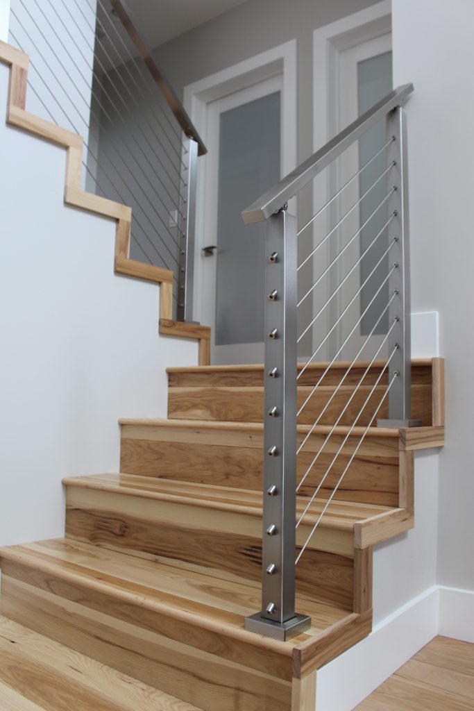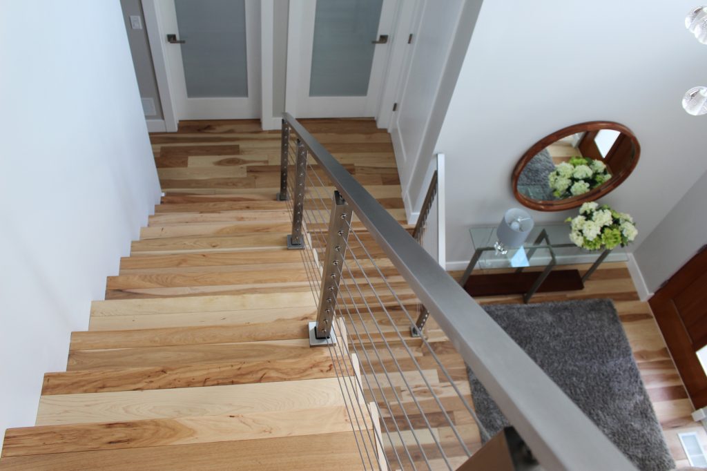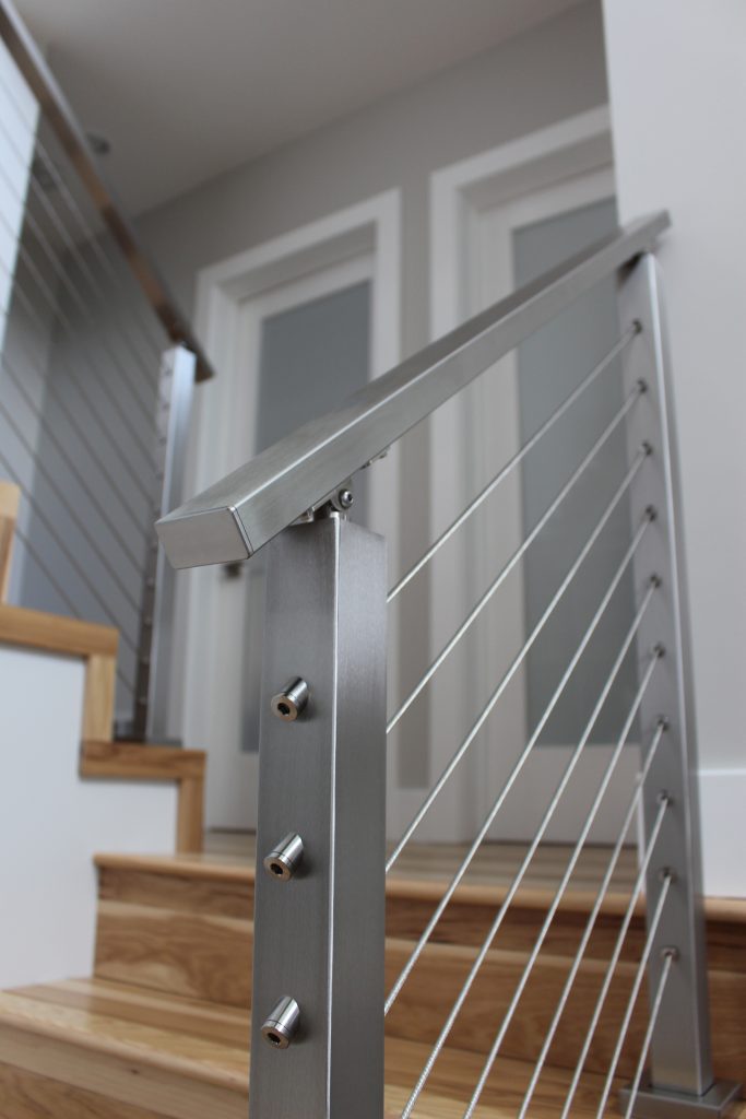 “The cable railing provided the modern feel we were looking for and was an economical, but still customizable, option to a hand-made railing from a local company. We opted for the smoother cable for a cleaner, more elegant, look. Instead of choosing a wooden handrail, we chose the stainless steel because we wanted to keep the beauty of both the railing system and floor separate. The contrast between the wood and metal would not have been as striking if the two were melded together.”