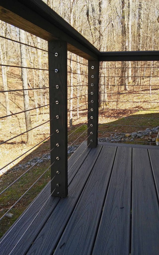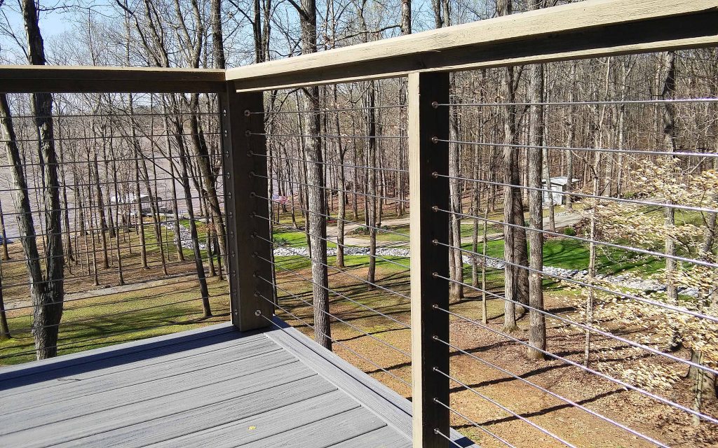 This deck in Kentucky has a wonderful view of a woods. In order to maintain the natural, rustic feel of their home, these homeowners chose our DriveTite cable railing system that was compatible with their wood posts. This gives the back yard and the deck a uniform appearance. In addition, the cable rail ensures that the entire view is clear from the deck. The changing seasons and wildlife are all visible for these customers to enjoy.