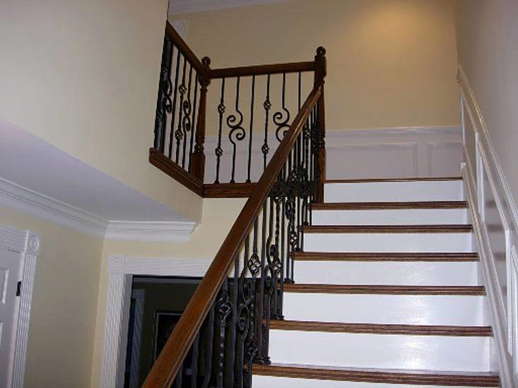 StairSupplies™ Scroll Series Iron Balusters are paired here with the Twist Series Iron Balusters. Coupled with turned newels and a volute on the handrail, this ornate stairway provides an endless amount of intrigue. The matching treads complement these pieces well as they stand out against the white risers, stringers, and trim. Click here to view your entire Wrought Iron Baluster offering.