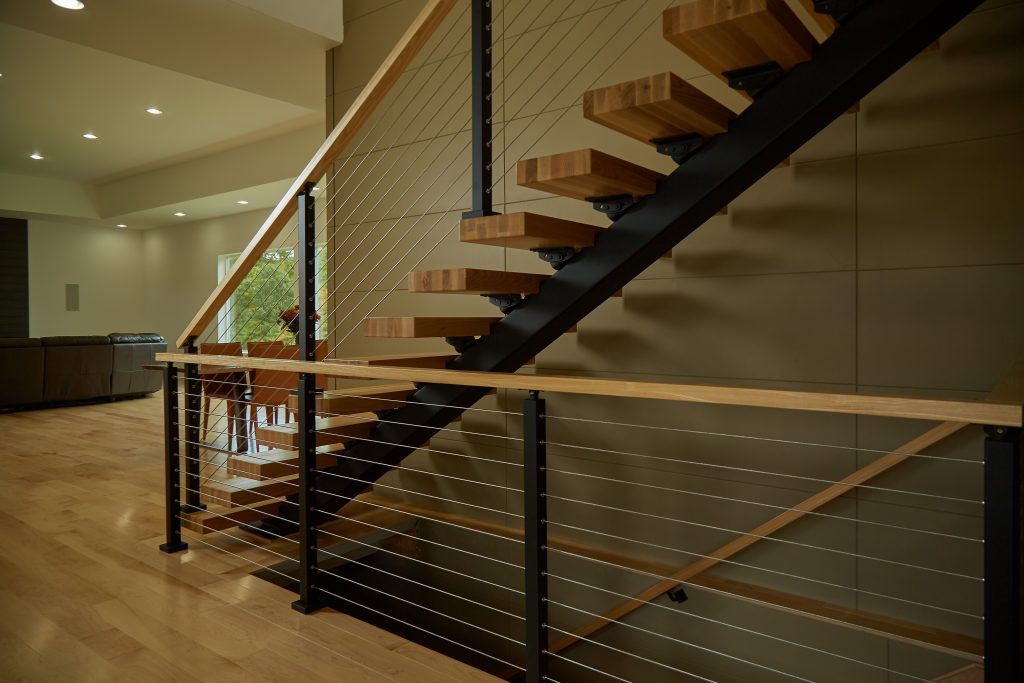 Our sleek, Mission-style Ash handrail coordinates perfectly with the treads and contrasts the sturdy black posts. A powerful black powder coated steel stringer holds the entire system up. This sleek, modern, and high-quality floating stair system is an eye-catching centerpiece–a conversation starter for years.