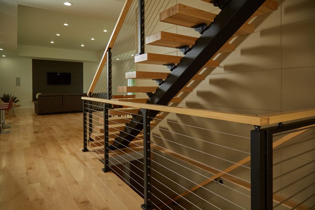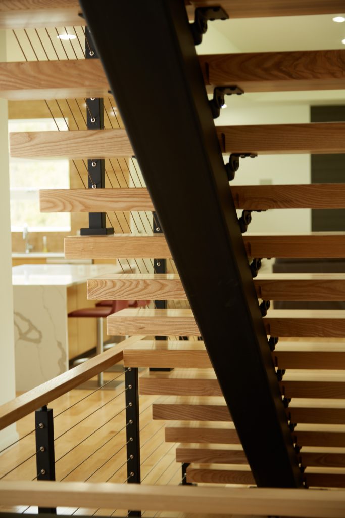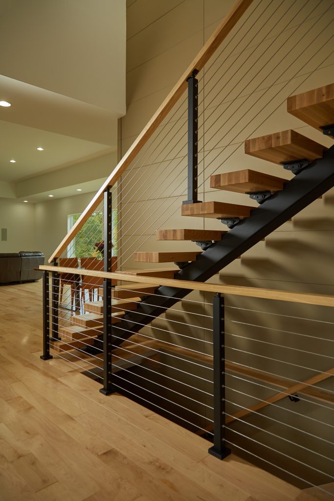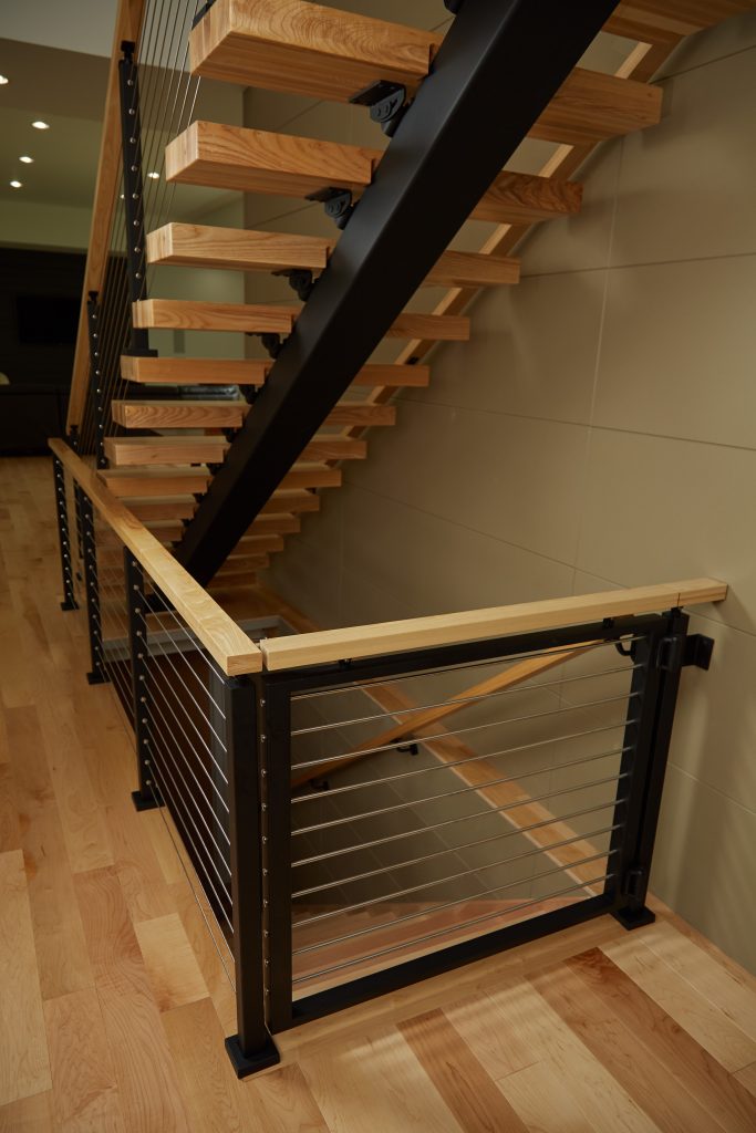 Our sleek, Mission-style Ash handrail coordinates perfectly with the treads and contrasts the sturdy black posts. A powerful black powder coated steel stringer holds the entire system up. This sleek, modern, and high-quality floating stair system is an eye-catching centerpiece–a conversation starter for years.