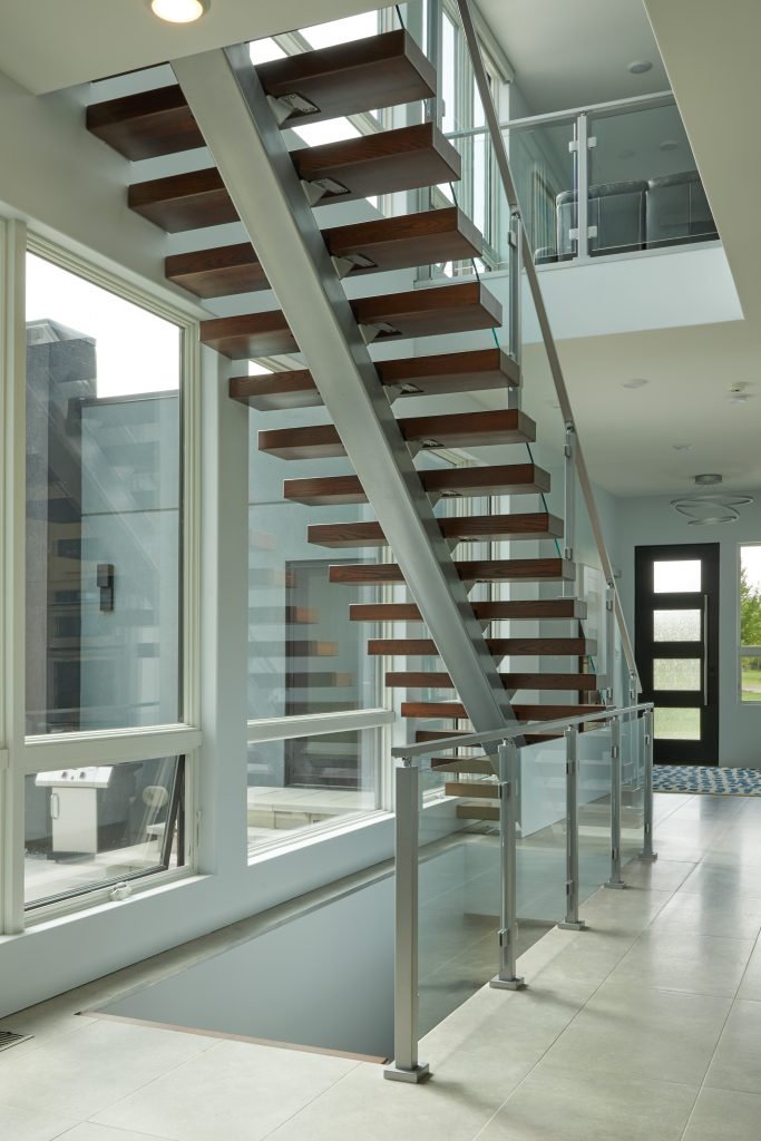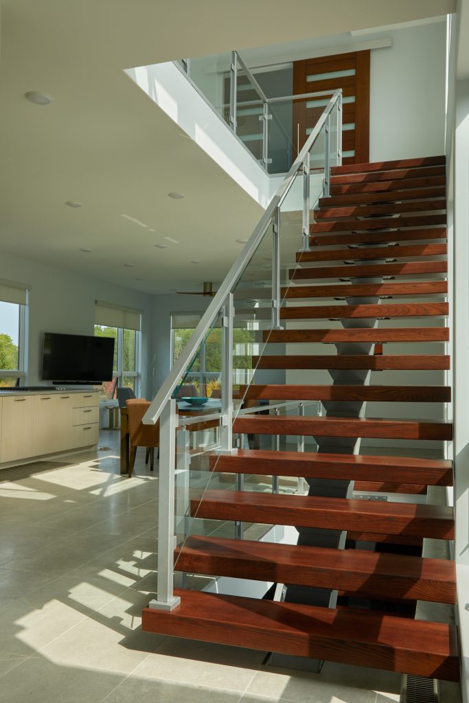 The Brusts selected 48” wide, thick Ash treads stained in Jav-88. The mild steel stringer, aluminum posts, glass clips and aluminum handrail are all powder coated in Speedboat Silver. The silver recedes visually to highlight the views while the medium-dark treads make a bold and substantial statement.
