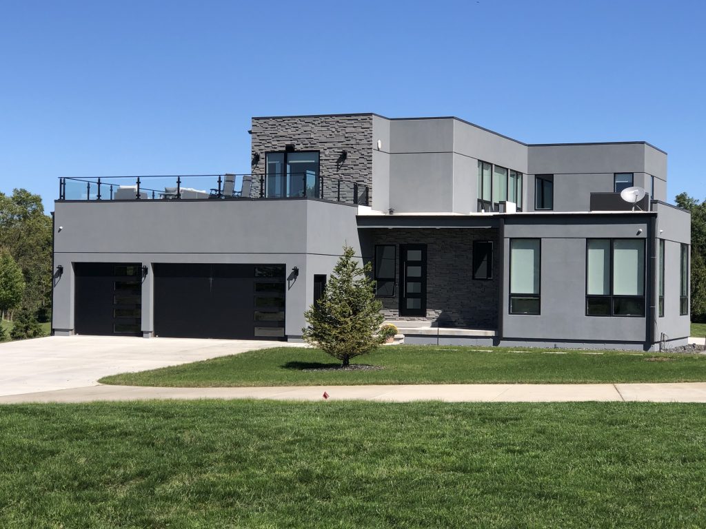 Tim and Karen Brust took their time to get their new home just exactly right. Even though they are lifelong residents of northwest Indiana, they share a love for the California/Arizona contemporary style of architecture. They dreamed of an open-floor-plan home with tons of windows and an eye-catching floating stairway as an interior focal point. The couple also wanted a flat roof, a pool, and a rooftop deck. They already owned 16 acres on a site that abuts an arboretum with thousands of trees that support wild turkeys and white tailed deer.