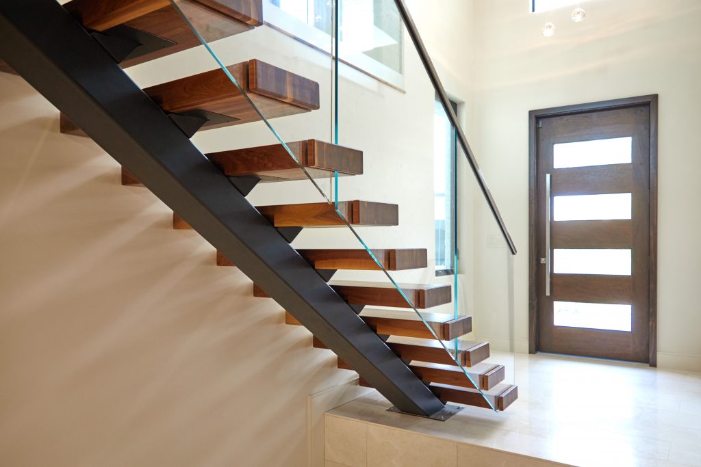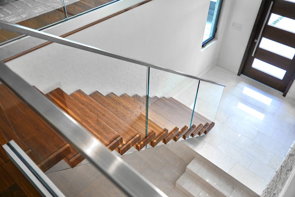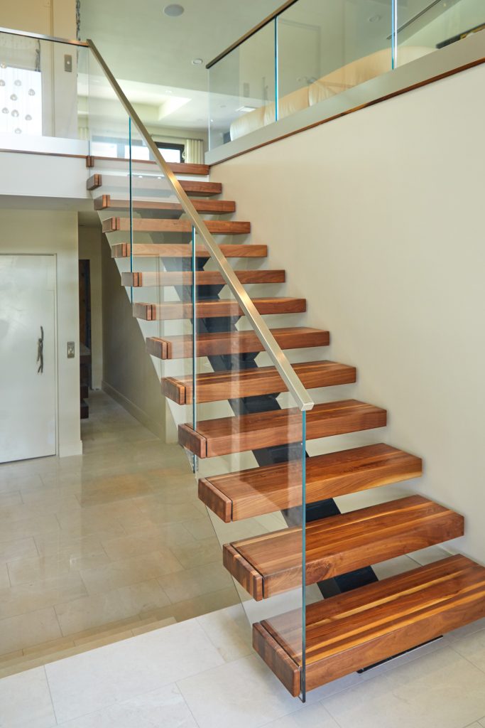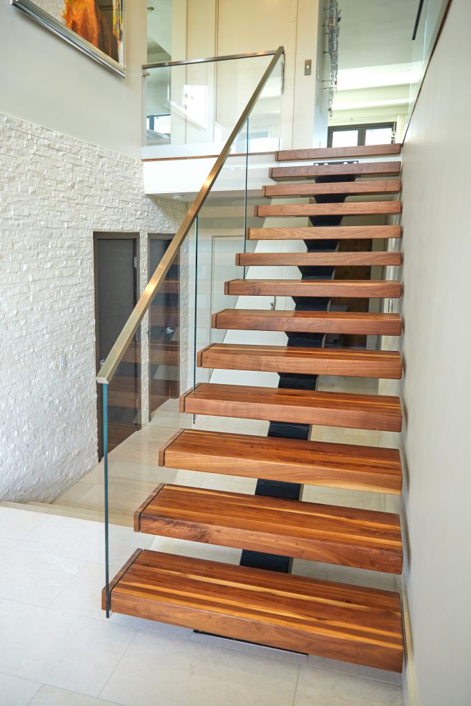 This Gulf-Side home is a great example of using a Floating Stair system to tie together a space. Glass railing allows the natural light brought in by the large front windows to light up the room, and expertly crafted walnut treads pair perfectly with the wooden color of the flooring. The metallic finish of the base rail and metal cap adopt the properties of the white flooring of the first floor and blend well the white walls of the second floor. A custom build FLIGHT package is not longer “just a stair,” but an exciting focal point of the house.