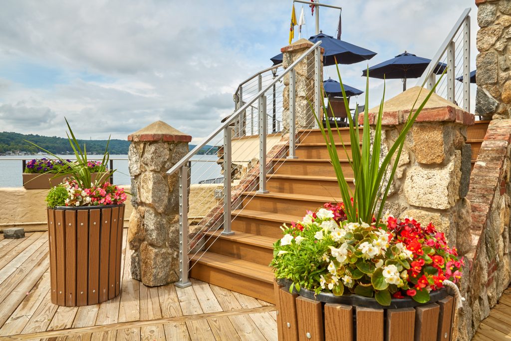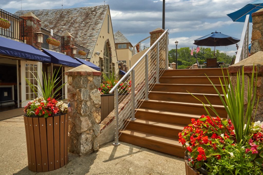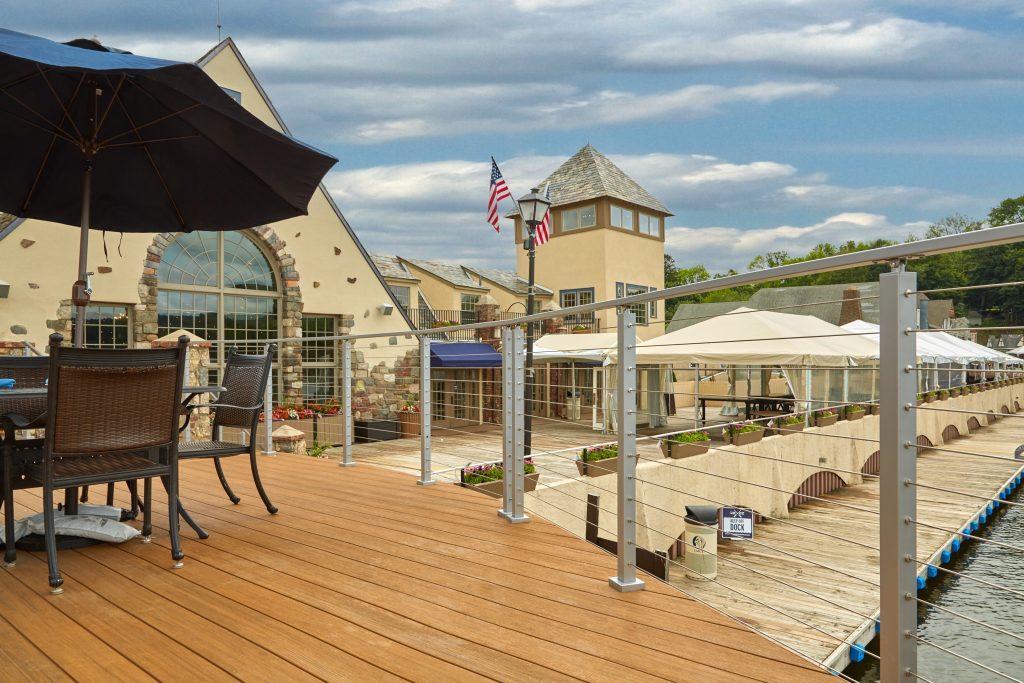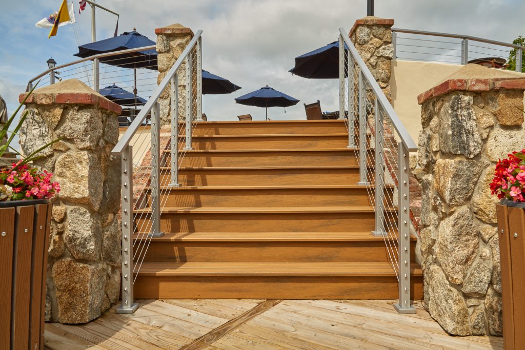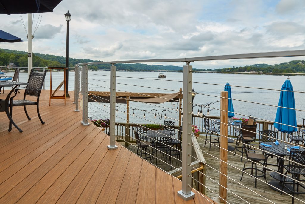 With a creative deck shape and beautiful view, this restaurant’s railing system had to be easy to install, flexible in design, strong and obscure. The owners opted for a Surface Mount cable railing system with a metal 1″x2″ handrail on top. Finished with a durable Fluoropolymer Speedboat Silver powder coat, not only does the railing blend in with it’s surroundings, but the finish will remain untarnished for years. In order to curve the railing with the edges of the deck, the installers used a few double posts and some great miters to create a seamless, smooth railing system.