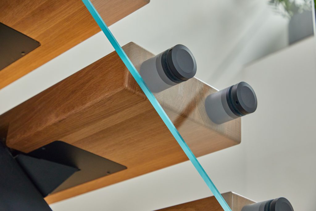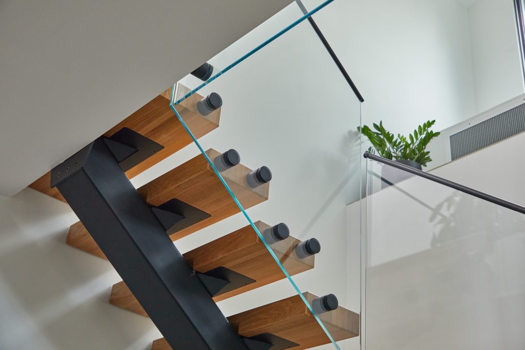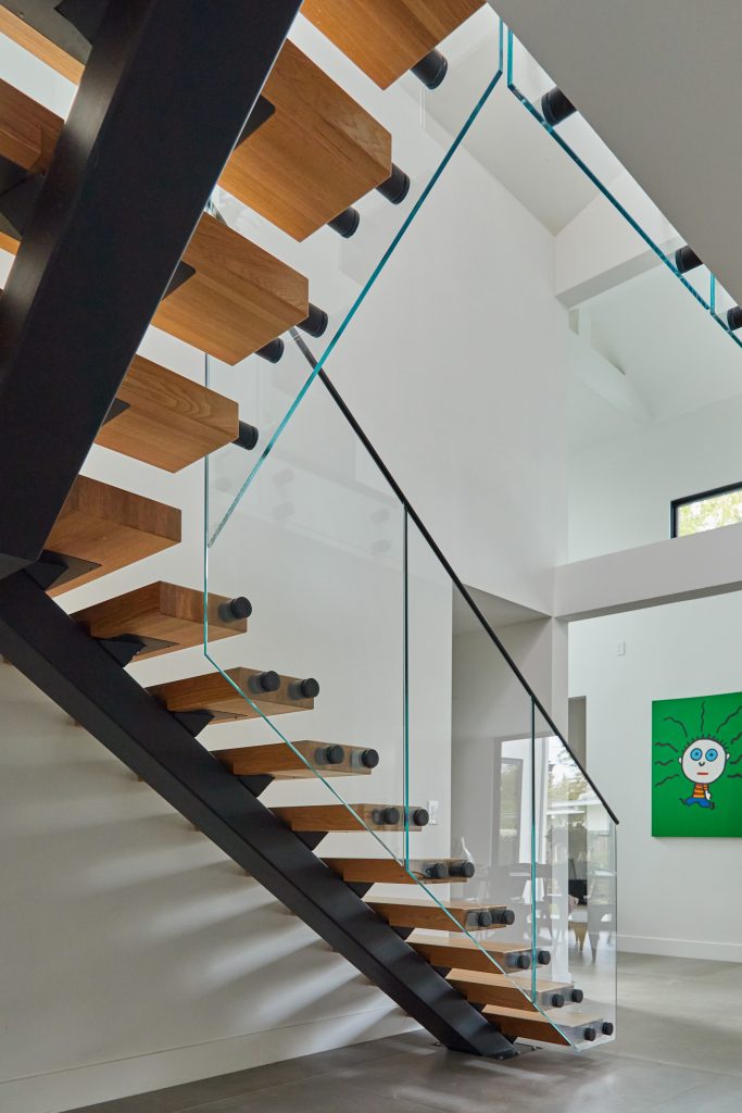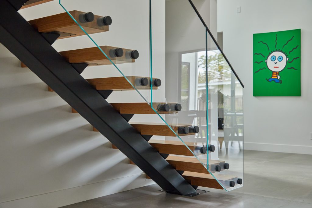 With high ceilings and a tall, open feeling to the space, these homeowners wanted a modern stair system that could be custom made to match their space. This 90 degree FLIGHT configuration uses a powder coated Black monostringer with a hockey stick design which attaches to the wall. White oak thick treads finished in a clearcoat provide a light contrast to the dark tones of the stringer and Black Standoff Pins. Each tread has two Standoff Pins holding custom made, low iron glass panels. Metal cap rail sits on top of the glass panels, tying together the runs and providing a graspable surface.