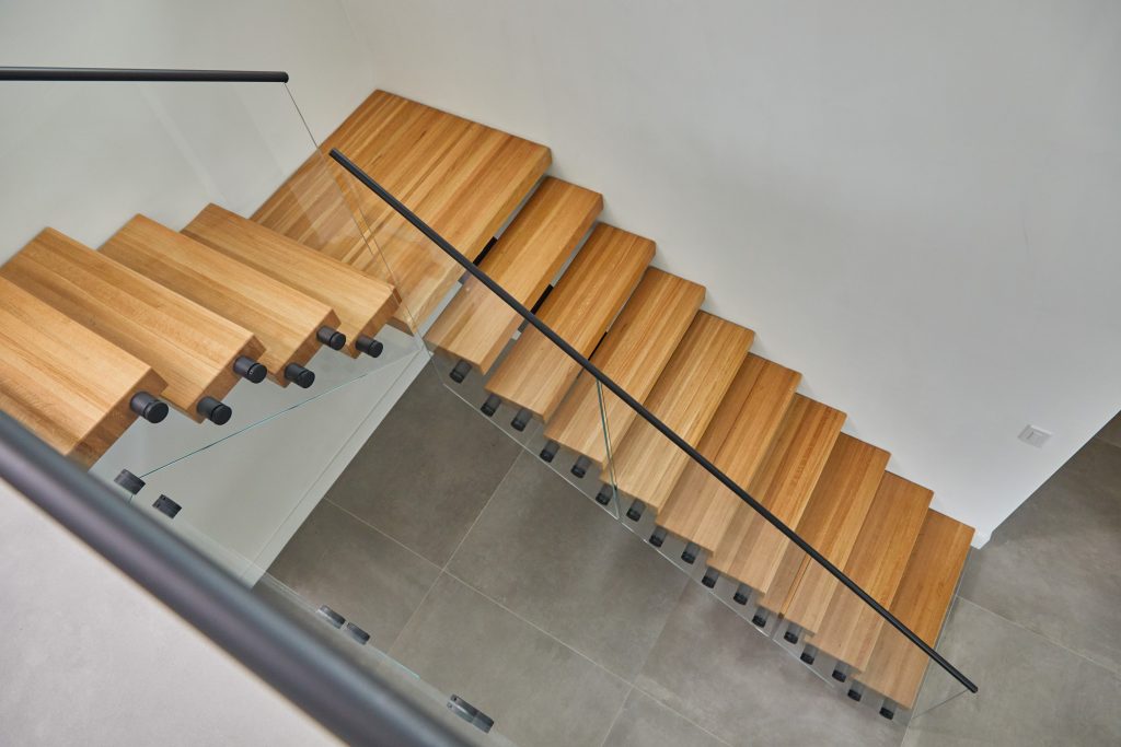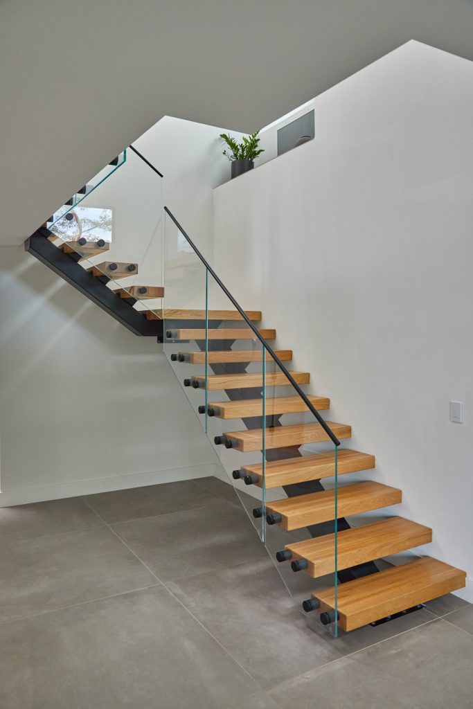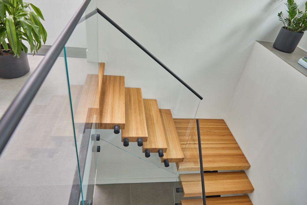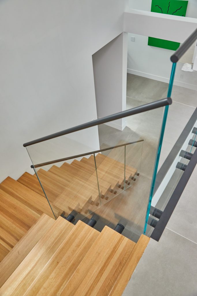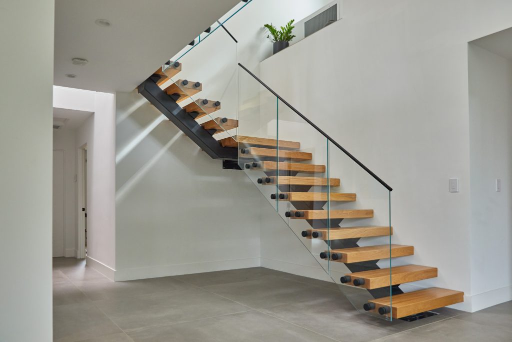 With high ceilings and a tall, open feeling to the space, these homeowners wanted a modern stair system that could be custom made to match their space. This 90 degree FLIGHT configuration uses a powder coated Black monostringer with a hockey stick design which attaches to the wall. White oak thick treads finished in a clearcoat provide a light contrast to the dark tones of the stringer and Black Standoff Pins. Each tread has two Standoff Pins holding custom made, low iron glass panels. Metal cap rail sits on top of the glass panels, tying together the runs and providing a graspable surface.