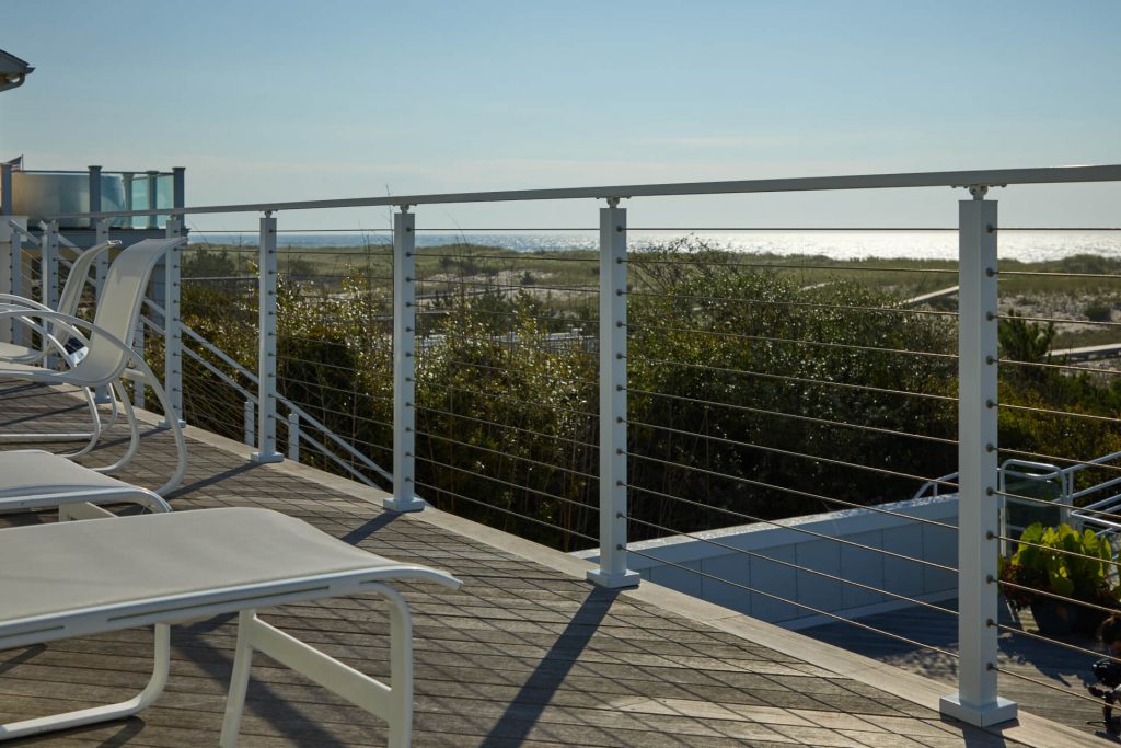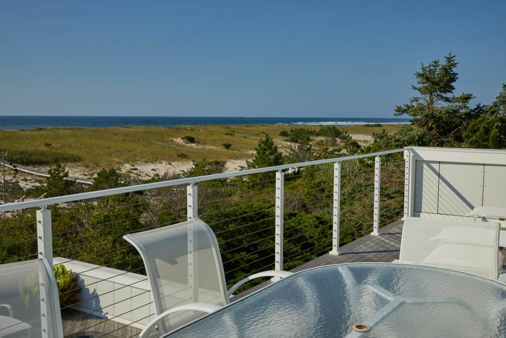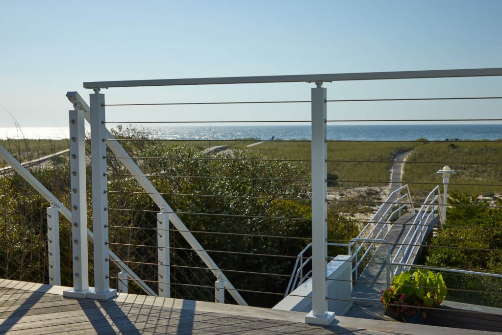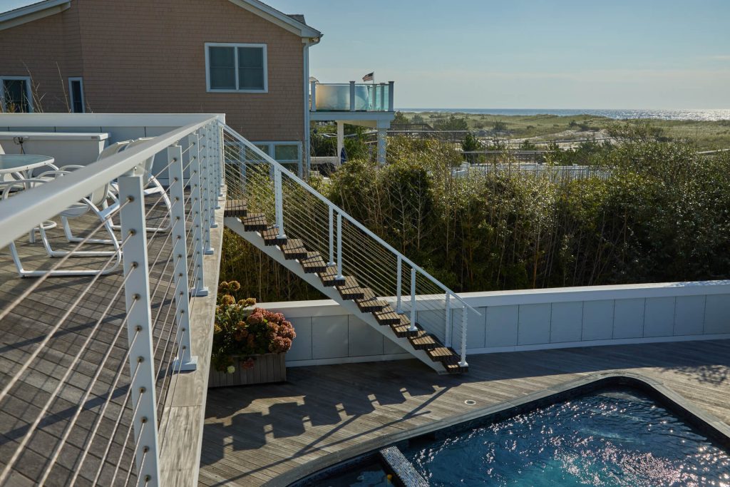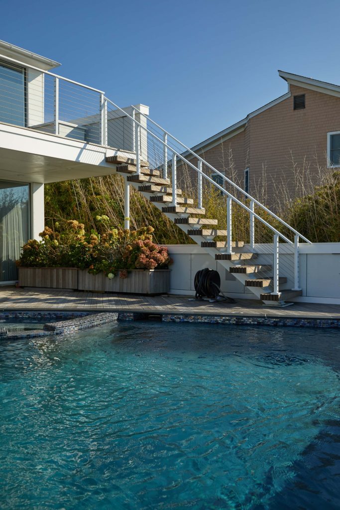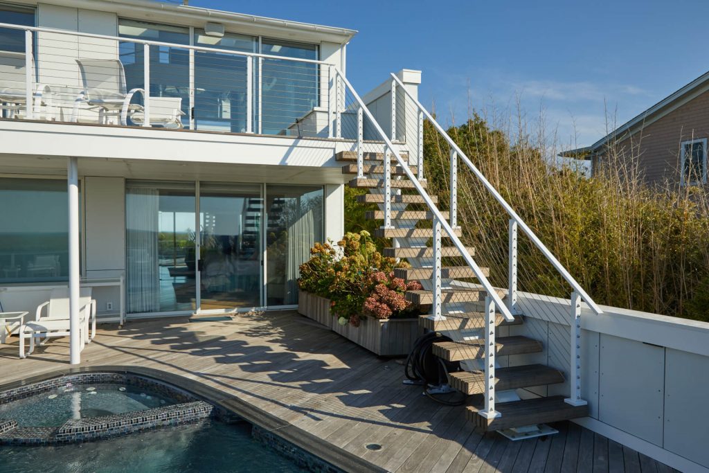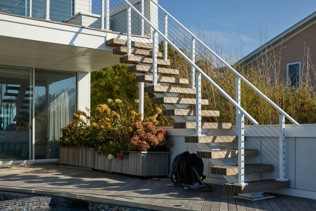 This project located in West Hampton, New York is located right up on beach. Surrounded by salt water, and close to chlorine from the pool, the project demanded a product that could withstand an aggressive environment. The customer choose Viewrail’s exterior rated FLIGHT system, which utilizes Endurance Treads and a Fluoropolymer Apollo White stringer. A Fluoropolymer powder coat is specifically designed to withstand harsh environments for years and years. When paired with the thermally treated Endurance treads, this becomes an extremely durable exterior floating stair system.