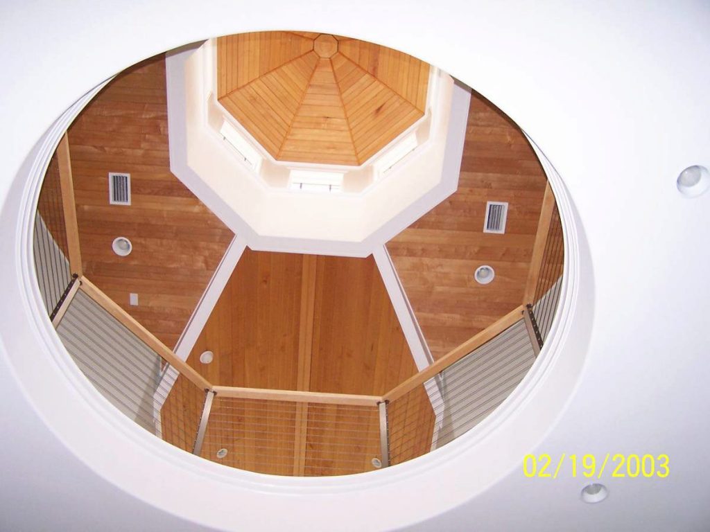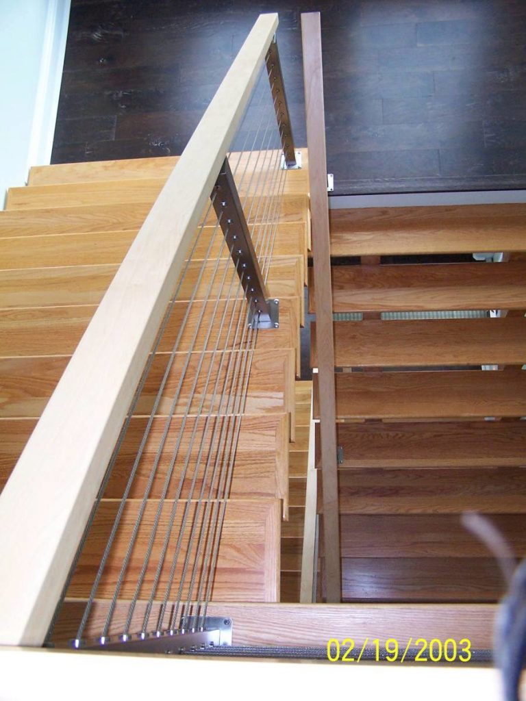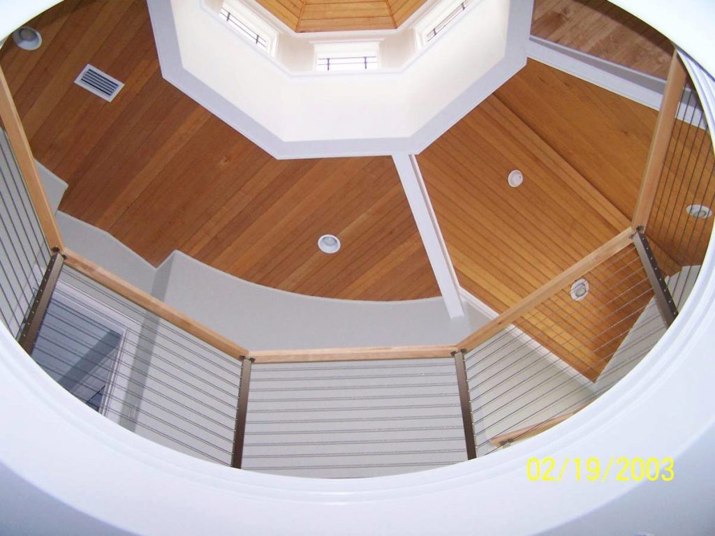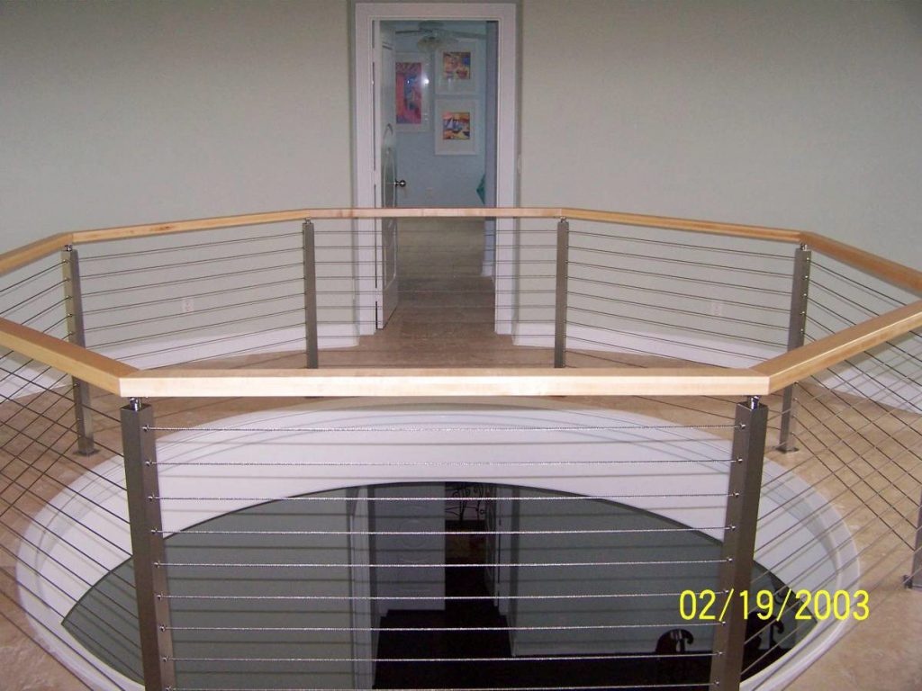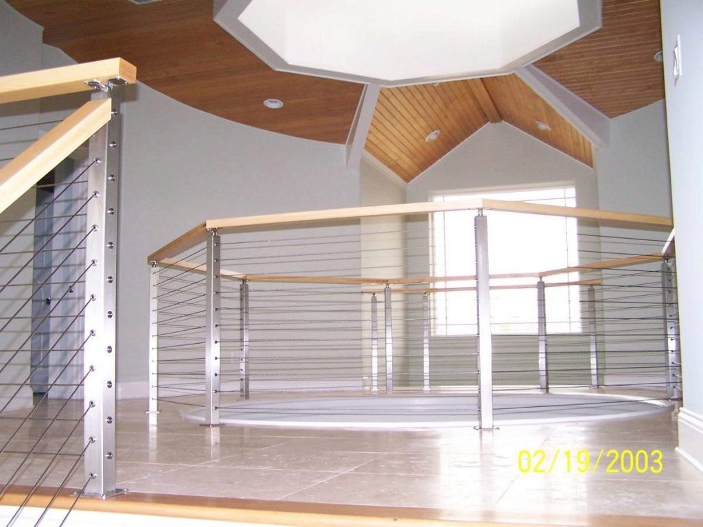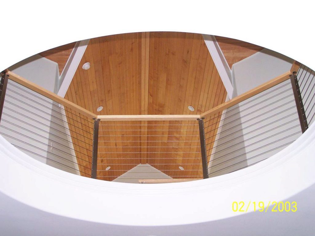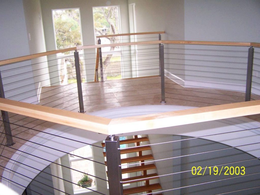Cable railing systems can come in a variety of forms. One of the biggest factors in the look of a system is its post finish. This system uses both brushed stainless steel and powder coated posts. Each finish brings its own character to a project. In this scenario, the powder coated posts are used to create a more pronounced railing on the highest floor, while the brushed stainless posts give a bright, clean appearance.