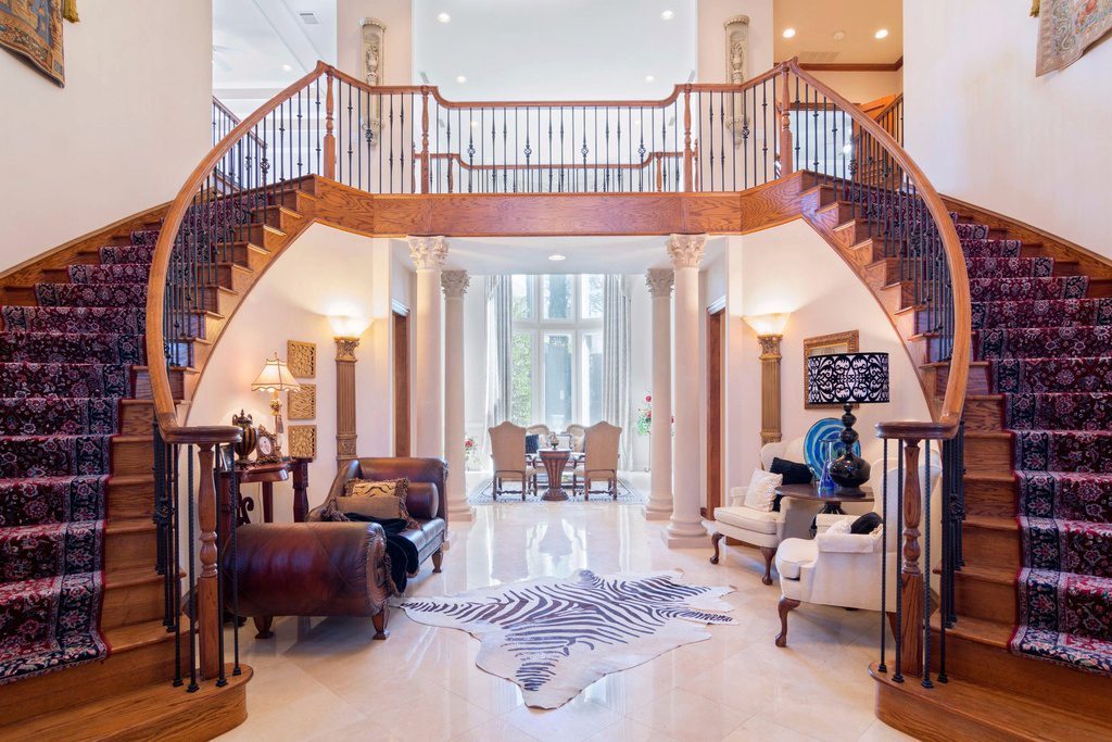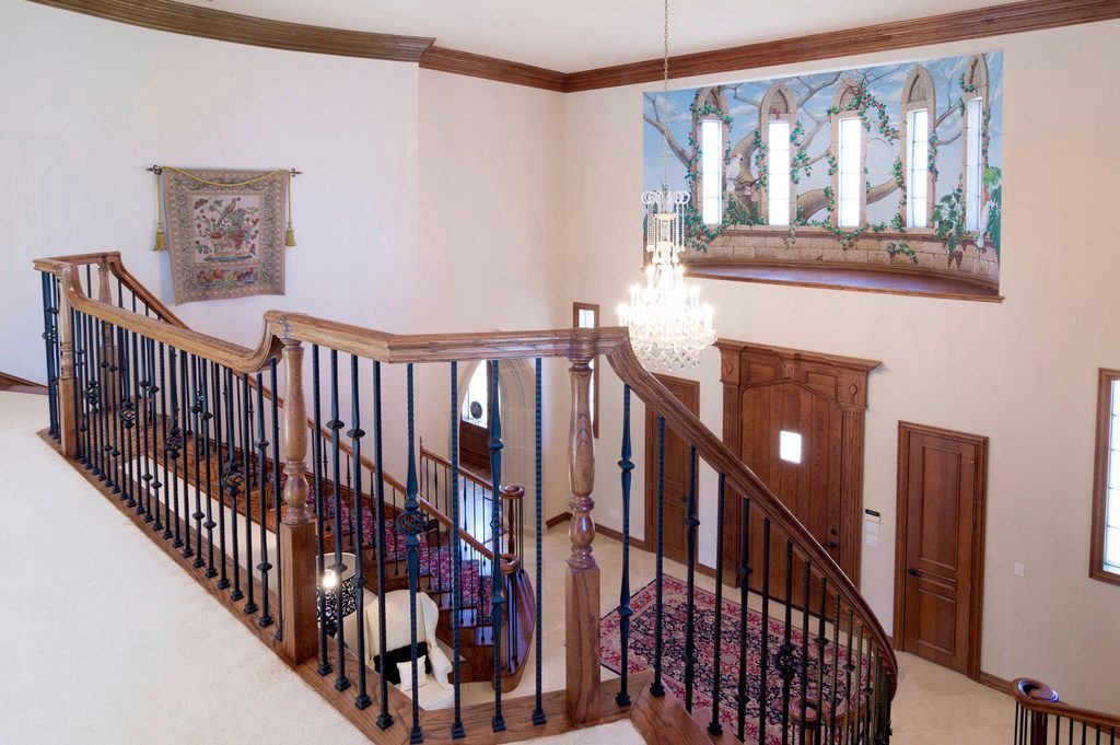 This grand stair case utilizes an over-the-post system and bending handrail. The wood is red oak with a Chestnut stain, while the gothic styled balusters have a black finish.