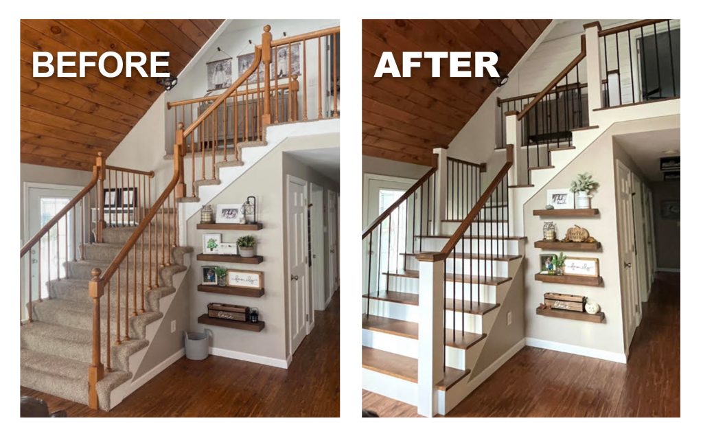 This customer created a beautiful entryway, updating the look of their home by refreshing their staircase with our products. This modern take of colonial style utilizes our 4130 Craftsman Box Newel, matching the white box newel structure with the surrounding white trim and risers. The upper flat newel cap reveals the Hickory wood, finished with an Acorn stain. The 6084 Handrail maintains the Hickory with Acorn finish between both floors, with custom miter returns and terminations. Additionally, the Custom Replacement Treads are built from the same Hickory wood as the handrail, with the same Acorn stain and finish, maintaining a cohesive aesthetic. Finally, the 9/16″ simple black balusters add beautiful contrast, providing a modern and elegant look to this traditional staircase.