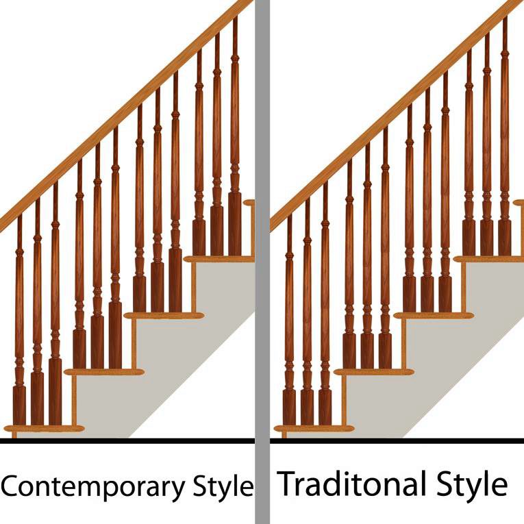 StairSuppliesTM offers balusters in two styles, Contemporary and Traditional. What varies between these two styles is the turning and block length, see below for details (click on images to the left to see examples):