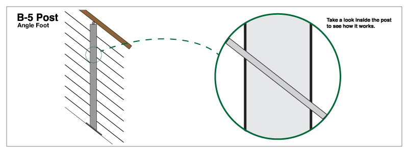 “B-5” – The “B-5″ post is designed to be an intermediate post on angled stair runs. It has offset* holes drilled on both sides of the post.