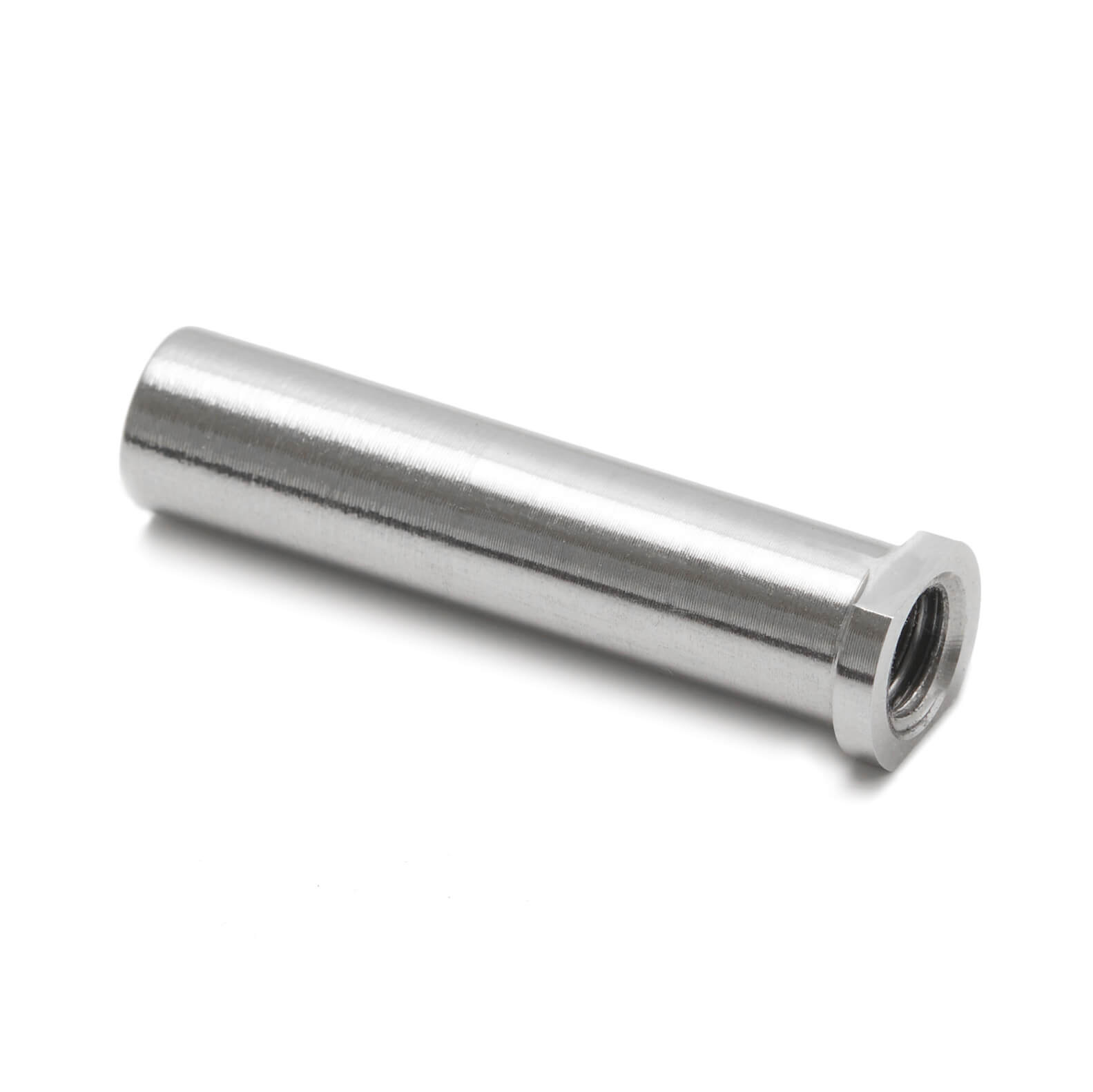 The Rod Angle Anchor is the receiving end of the Rod Angle Anchor Kit. It works with the Rod Threaded Crimp Fitting to lock the rod to the inside of a predilled hole in one of our posts. The inside is threaded to accept the Crimp Fitting.