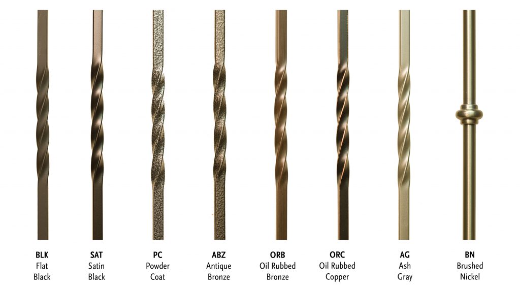 The iron color sample pack contains samples that show off our most popular iron baluster finishes: Black, Satin Black, Powder Coat, Antique Bronze, Oil Rubbed Bronze, Oil Rubbed Copper, Ash Grey, and Brushed Nickle. Keep in mind that not every iron baluster series is available in every finish. Make sure to take a look at the series you’re interested in to find out which finishes are available in the style you love.