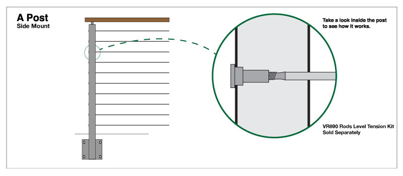 “A-5” – The “A-5″ post is designed to be an intermediate post on level runs. It has level holes drilled on both sides of the post. The rods will simply pass directly through the post, no additional fittings are required.
